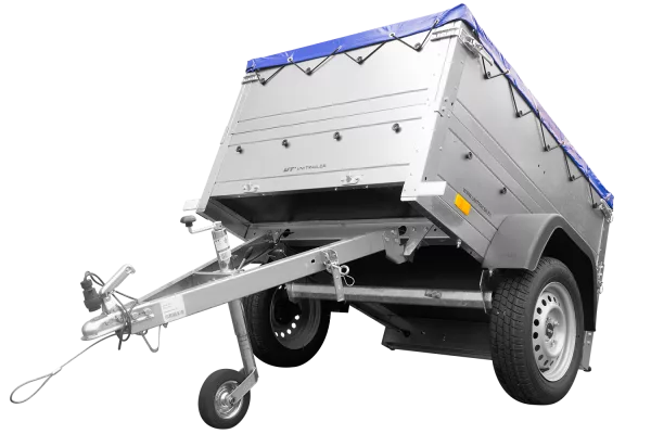 Remorque petite à benne basculante avec bâche plate bleue, rehausses de ridelles et roue jockey du modèle Garden Trailer 150 KIPP. Grâce à la petite surface de transport de 150×106 cm, la remorque vous permettra de transporter de lourdes charges ou d’objets de petites dimensions qui ne seraient normalement pas transportables dans votre voiture. En outre, le PTAC maximal de 750 kg permet à chaque conducteur de fixer la remorque au crochet. La bâche haute avec arceau et rehausses de ridelles offrent une protection supplémentaire pour les marchandises transportées. En utilisant l’essieu directeur moderne de la marque AL-KO ou KNOTT, nous garantissons qu’aucun trou sur la route ne va poser de problèmes, même lorsque vous voyagez avec une surface de transport déchargée. Avec notre petite remorque à benne basculante du modèle Garden Trailer 150 KIPP, le transport de vos biens sera toujours confortable et sécuritaire.